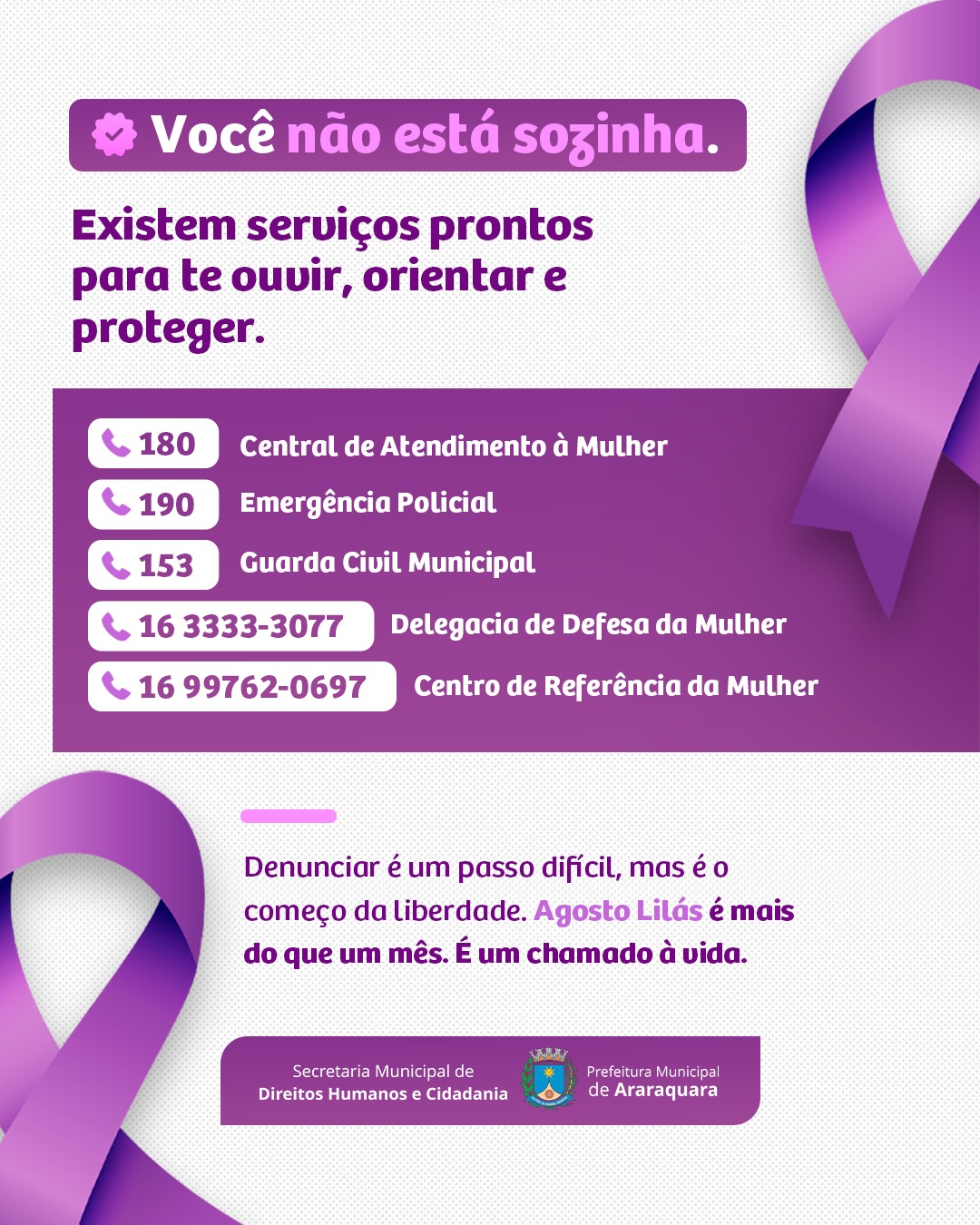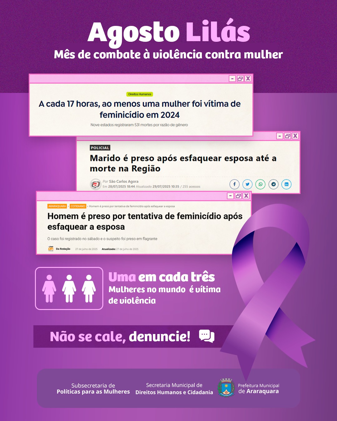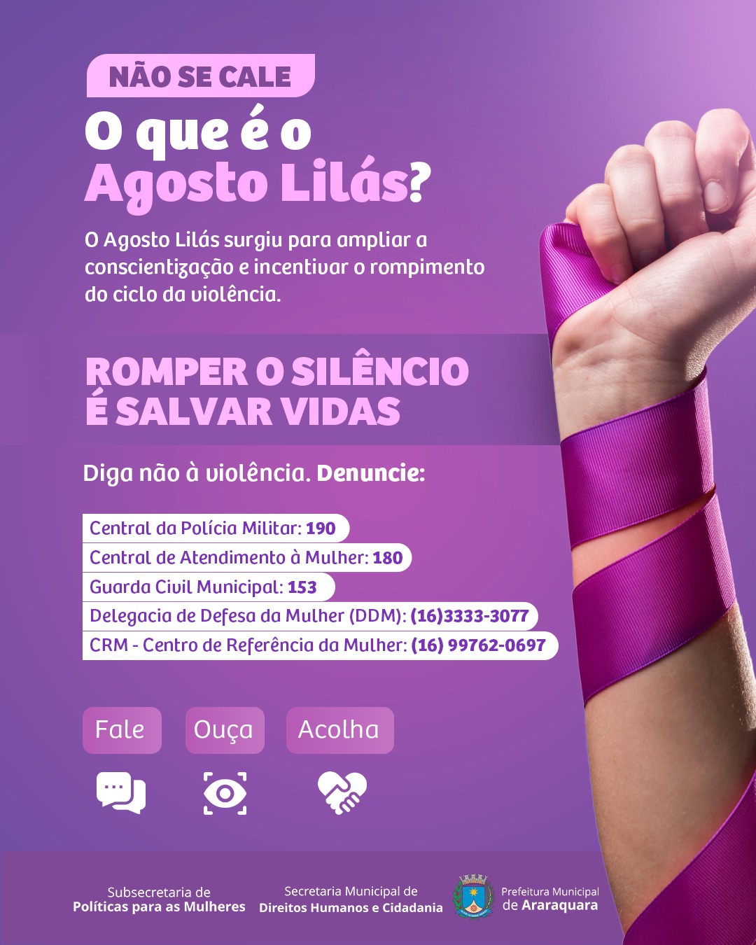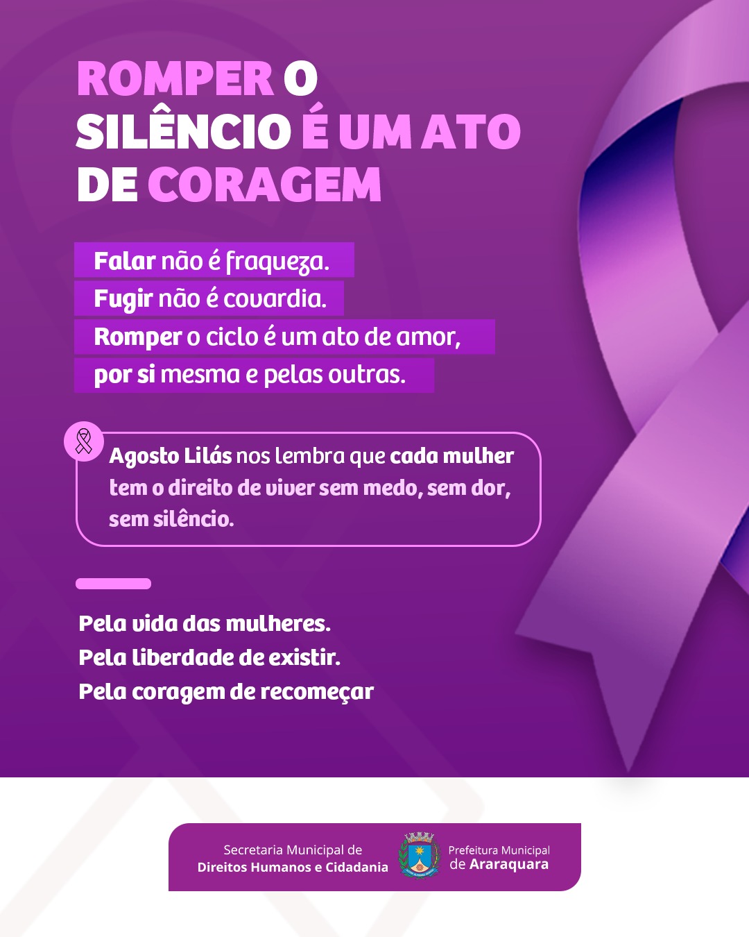 O Agosto Lilás é um mês dedicado à conscientização sobre a violência contra a mulher e à promoção de uma cultura de respeito, proteção e empoderamento feminino.O tema deste ano, “Romper o silêncio é salvar vidas”, reforça a importância de denunciar situações de violência, oferecer apoio às vítimas e fortalecer redes de acolhimento e proteção.