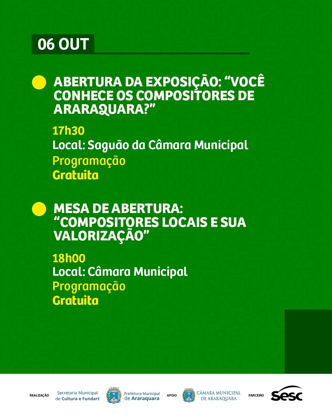 Às 17h30, o público poderá conferir a exposição “Você conhece os compositores de Araraquara?”, instalada no saguão da Câmara (Rua São Bento, 887 – Centro). A mostra reúne informações e materiais sobre criadores musicais que ajudam a contar a história da cidade através de suas canções.