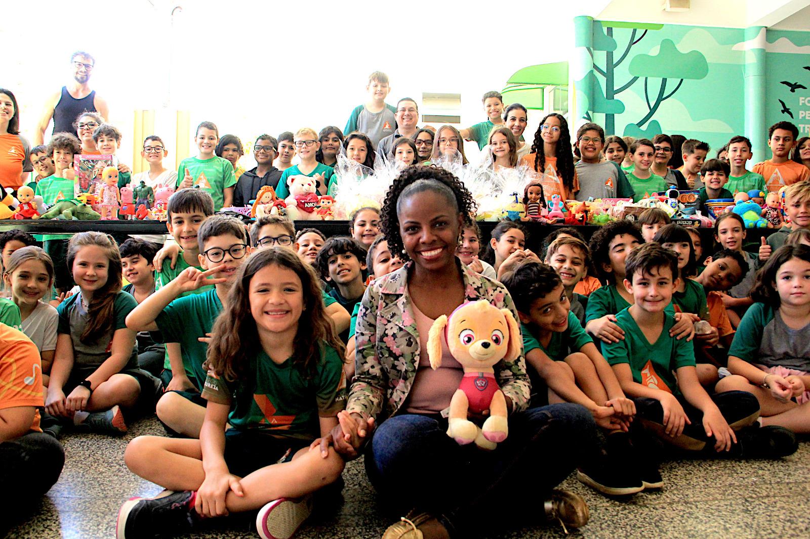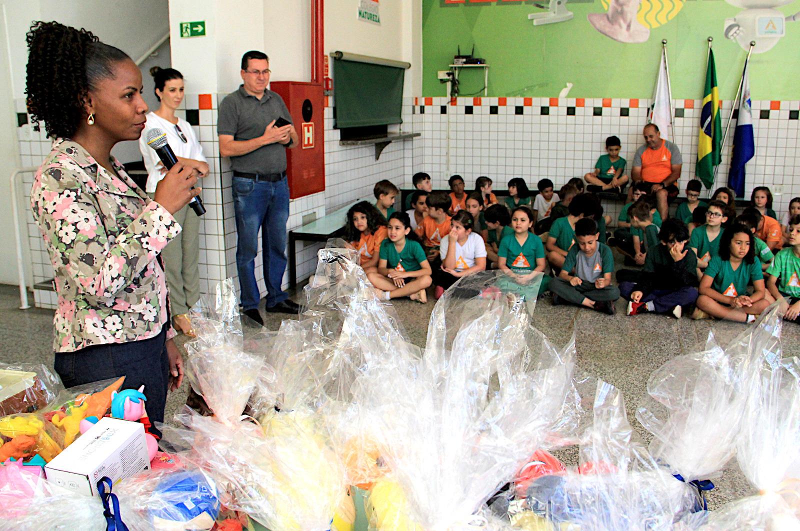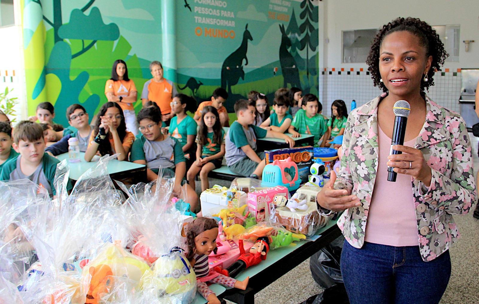 Na última quinta-feira (6), a vice-prefeita e secretária de Desenvolvimento Social, Meire Laurindo, e a subsecretária de Proteção Social, Ana Paula de Souza, estiveram no Colégio Natureza para participar da cerimônia de entrega de 310 brinquedos arrecadados em uma campanha realizada pelos alunos da instituição. A doação será direcionada para as três unidades do Programa Municipal de Acolhimento Institucional Provisório (PROMAIP), serviço que oferece acolhimento provisório para crianças e adolescentes.