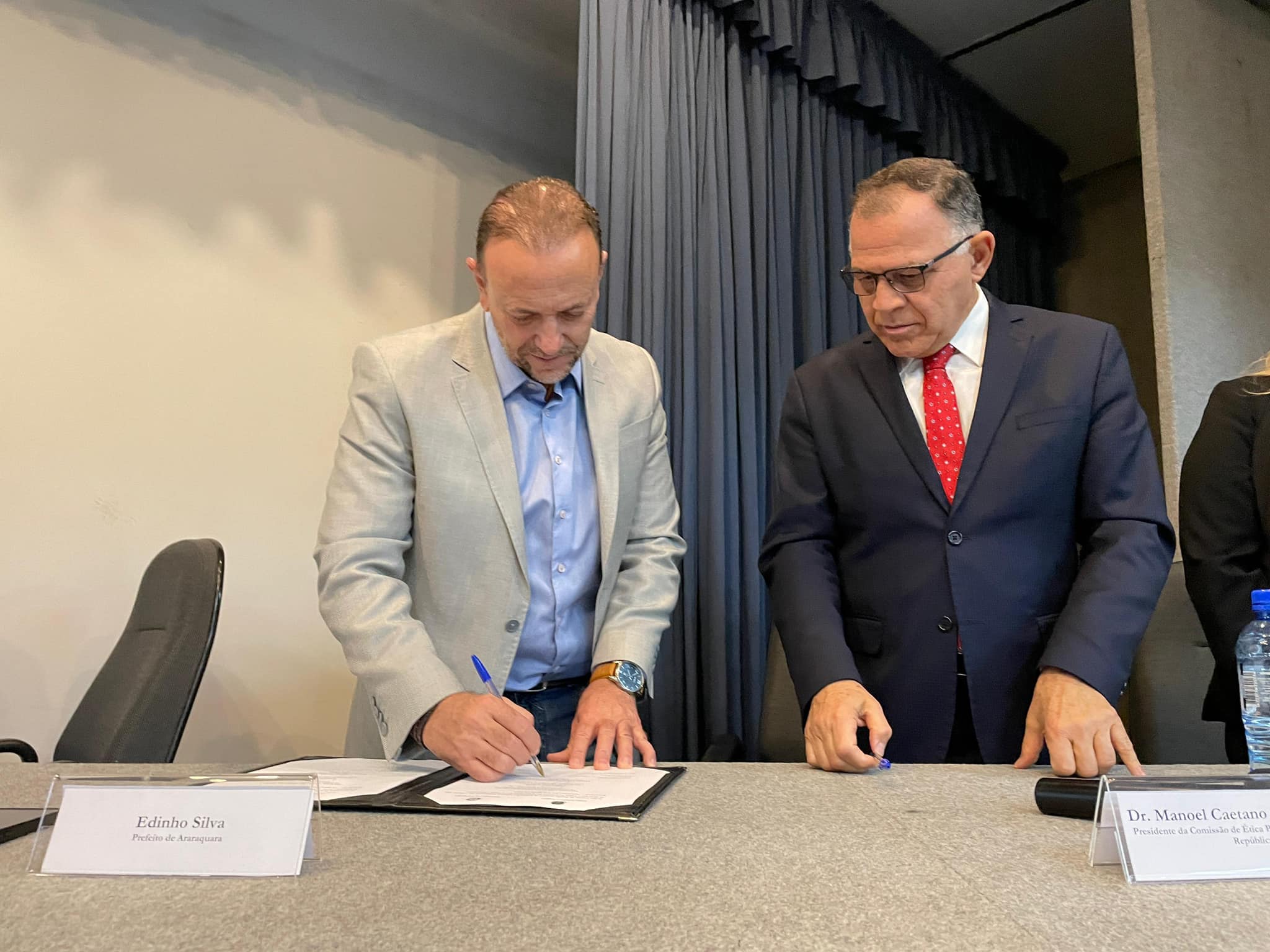 Em cerimônia realizada no auditório José Araújo Quirino dos Santos, da Universidade de Araraquara (Uniara), na noite de quinta-feira (8), o prefeito Edinho, o presidente da Comissão de Ética Pública (CEP) da Presidência da República, Manoel Caetano Ferreira Filho; e o presidente da Comissão de Ética Pública do Município de Araraquara, Fernando Passos, assinaram um acordo de cooperação que visa parceria para a promoção de ações integradas, apoio mútuo e intercâmbio de experiências, informações, tecnologias e metodologias relacionadas à gestão da ética no serviço público.