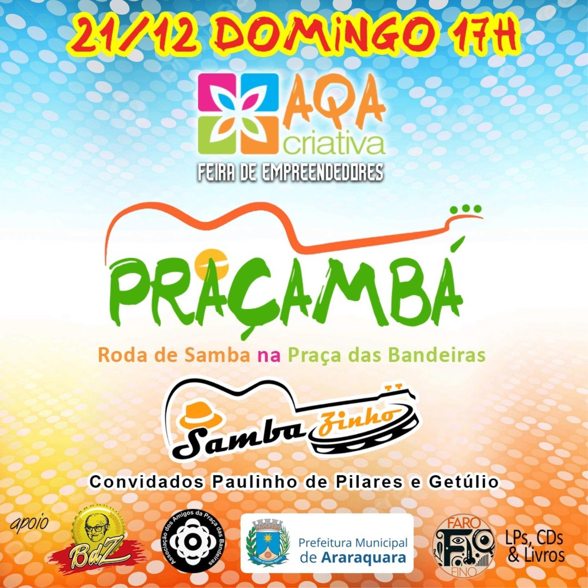 Ainda no domingo, o projeto “Praçambá” agita a Feira Aqa Criativa na Praça das Bandeiras, das 17h às 22h, com a roda de samba comandada pelo grupo SambaZinho. A programação também apresenta expositores de gastronomia com lanche de pernil, pastel, milho, porções, doce, além de artesanato e de sebo de vinil - entre outros. O samba vai embalar a programação com o projeto “Praçambá” que apresenta o grupo SambaZinho às 18h30. Com uma animada roda de samba, o Praçambá leva alegria e tradição para a comunidade, com música ao vivo em evento aberto ao público.