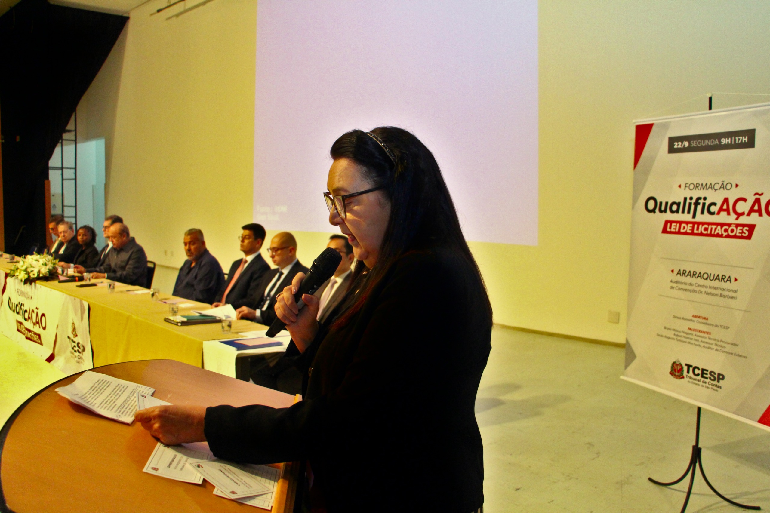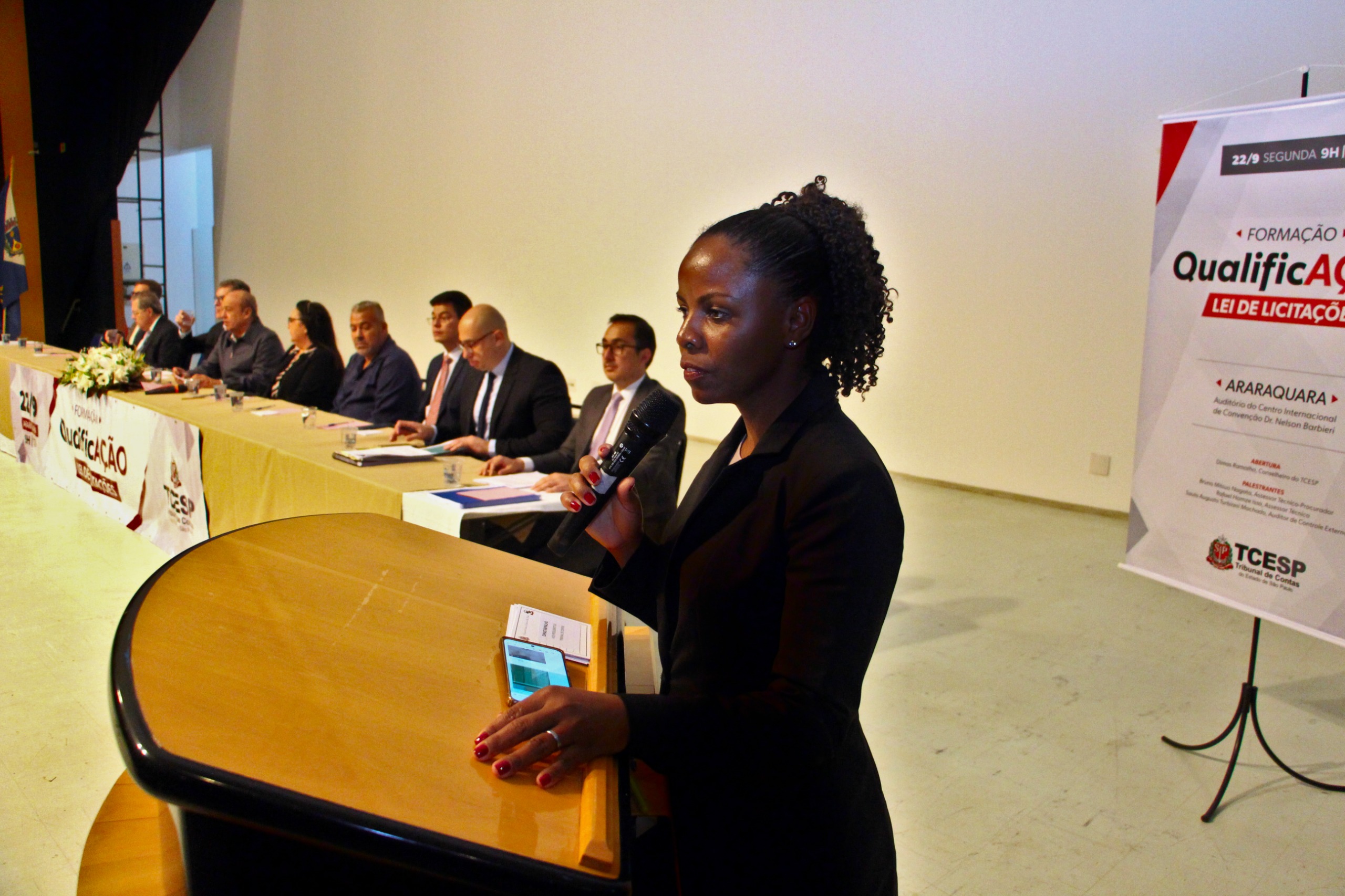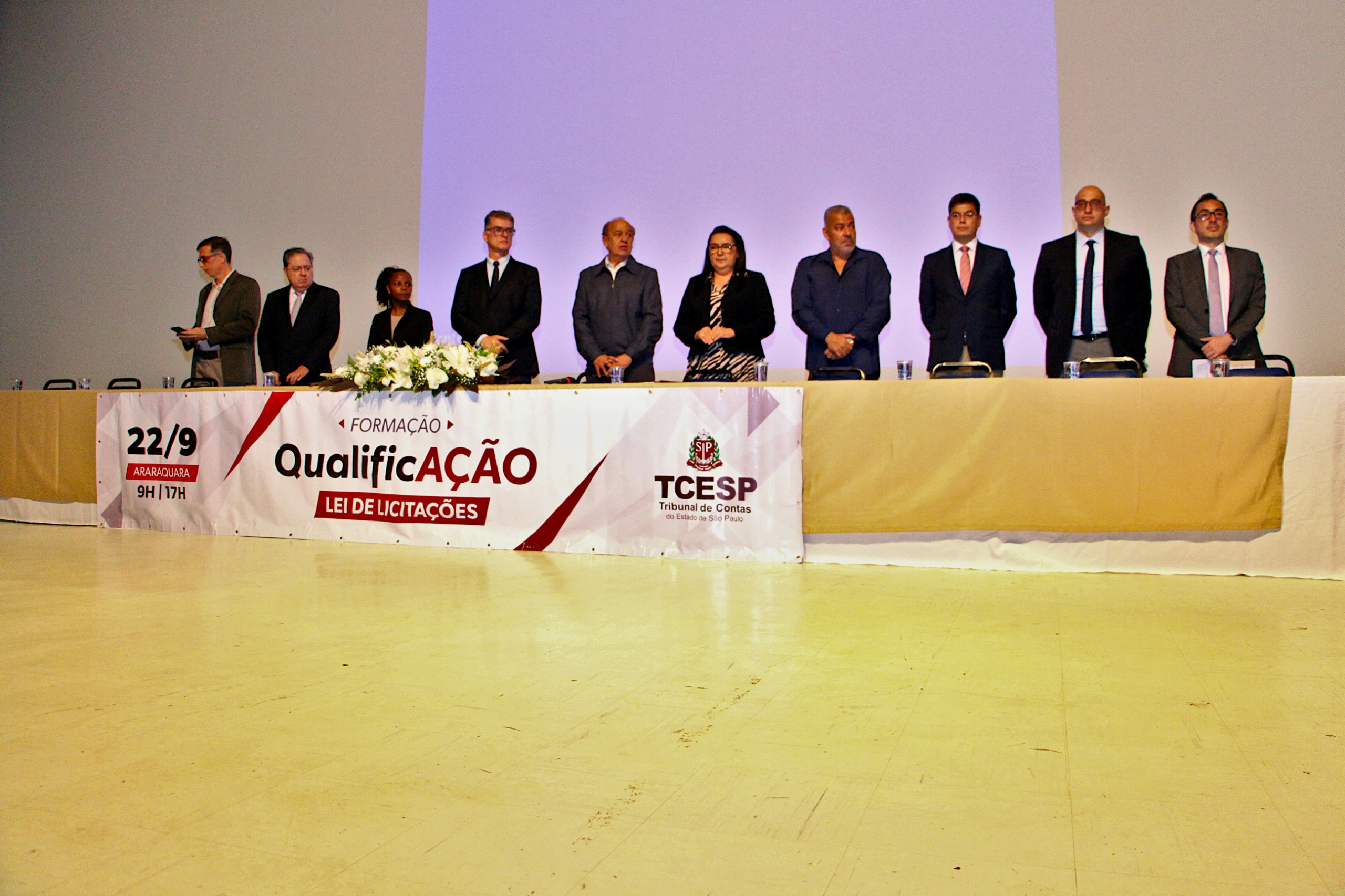 A mesa solene reuniu diversas autoridades e especialistas: a vereadora Geane Trevisoli, representando a Câmara Municipal de Araraquara; a vice-prefeita e secretária de Desenvolvimento Social, Meire Laurindo; o prefeito de Gavião Peixoto e presidente do CONCEN, Adriano Marsall, que representa 49 municípios; o diretor substituto da Unidade Regional do Tribunal de Contas de Araraquara, Carlos Serrano; os assessores técnicos e palestrantes do TCE, Rafael Issa e Bruno Mitsuo Nagata; o auditor do Tribunal de Contas e palestrante Saulo Augusto Turbiani; e o coordenador do curso de Direito da Uniara, professor e Dr. Fernando Passos.